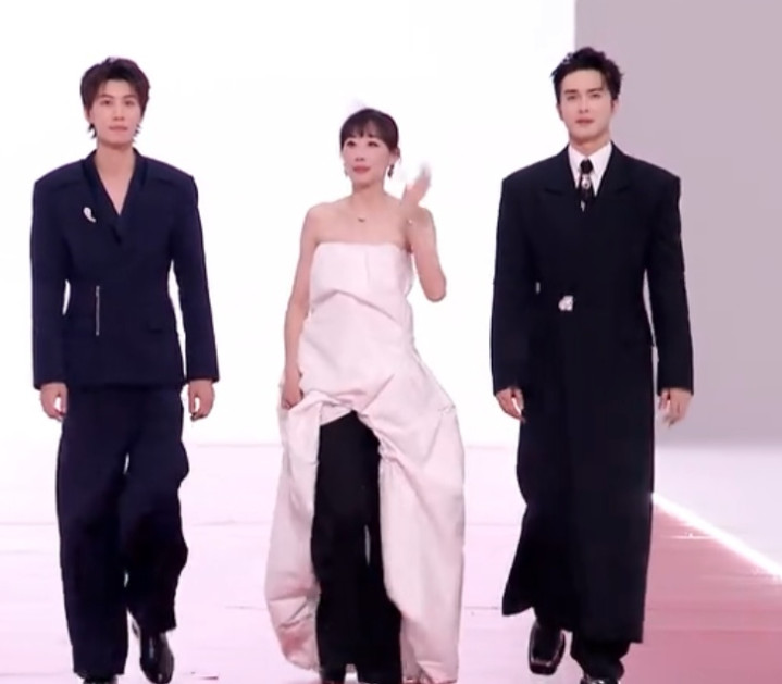 但紧身的礼服和不争不抢温柔的裸粉色,让礼服的量感很小,没有大气场或者很强的力量感去压轴。