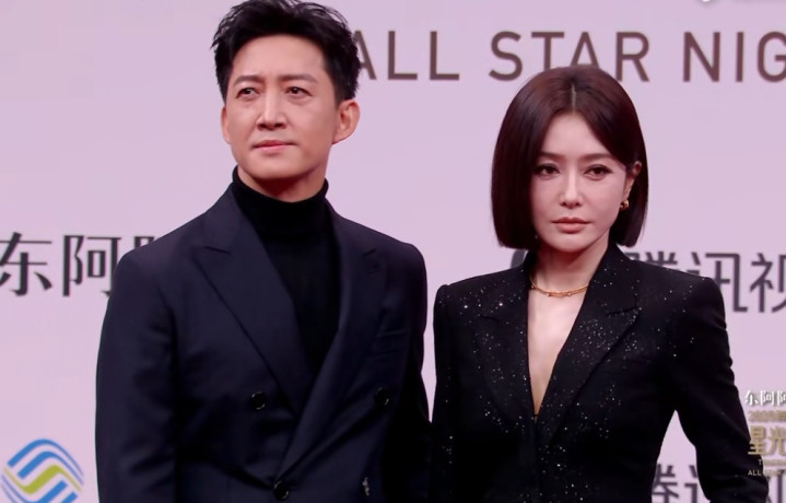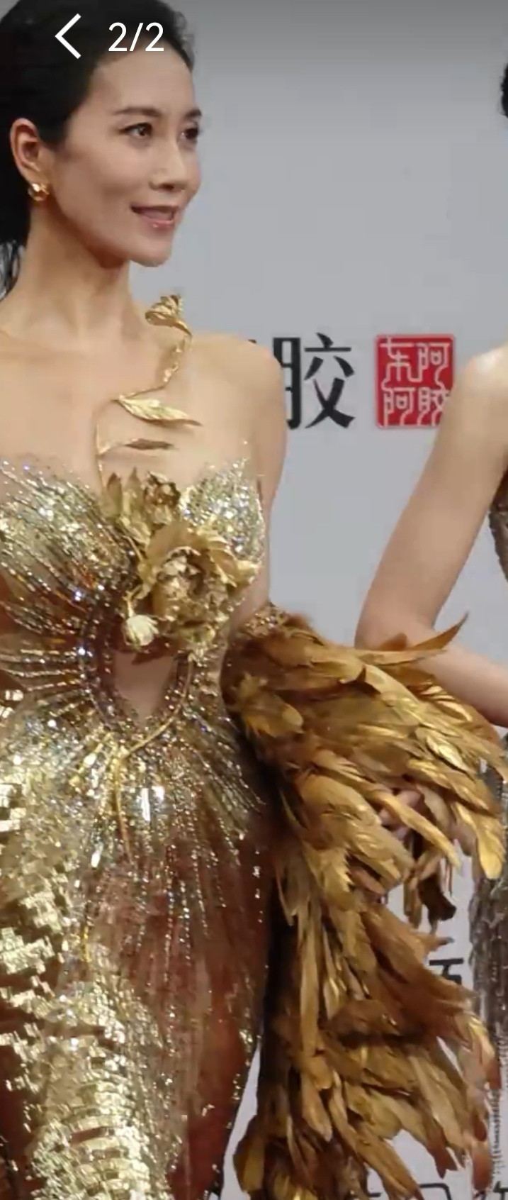 温峥嵘的金色礼服虽然没有太多的质感,但是衣服的重量,与她岁月侵蚀的知性从容气质正好相配。