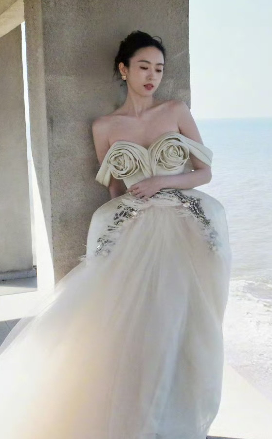 米白色的礼服一直很适合她清新淡雅的气质,上半部分紧包身材,突出强调身材的曲线感。