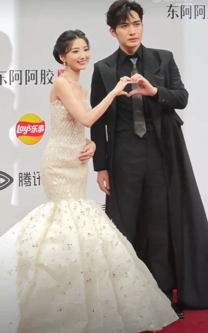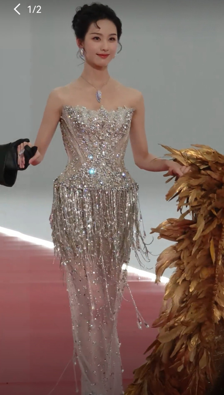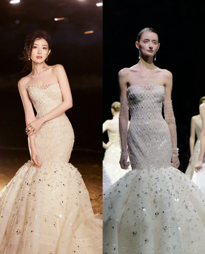 礼服来自IVAN YOUNG,与模特相比,模特的直角肩和冷冽的气势,将礼服带向不食人间烟火的仙女,而毛晓彤却穿出自己的气质,干净又清甜。
