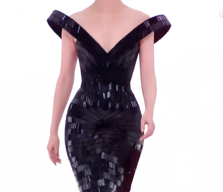 本身身高172cm,再穿上这套中东风格的黑色礼服,虽然她只有28岁,但却能hold住这套全身黑色礼服。