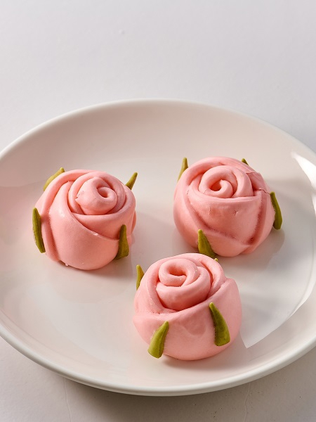 春风松月楼的外带窗口前,胖嘟嘟的粉红玫瑰花包格外吸睛,软萌外形搭配清新口感,让素食爱好者也能尽享春日限定美味。